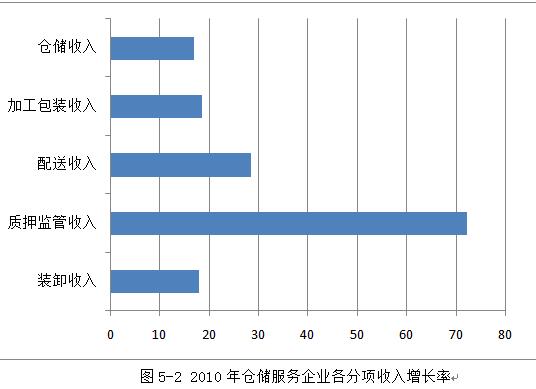 其中,提供倉儲(chǔ)收入的企業(yè)有138加,提供裝卸收入的企業(yè)90家,提供配送收入的企業(yè)40加,提供加工包裝收入的企業(yè)30加,提供質(zhì)押監(jiān)管收入的企業(yè)26加。質(zhì)押監(jiān)管收入和配送收入增幅最大,是因?yàn)楸O(jiān)管貸款額與配送量大幅增長(zhǎng)。根據(jù)26加提供質(zhì)押監(jiān)管服務(wù)企業(yè)提供數(shù)據(jù)顯示,2010年質(zhì)押監(jiān)管貸款授信額度增長(zhǎng)了74.5%(由2009年的196億元增長(zhǎng)到2010年的342億元,不含中外運(yùn)公司的數(shù)據(jù))。